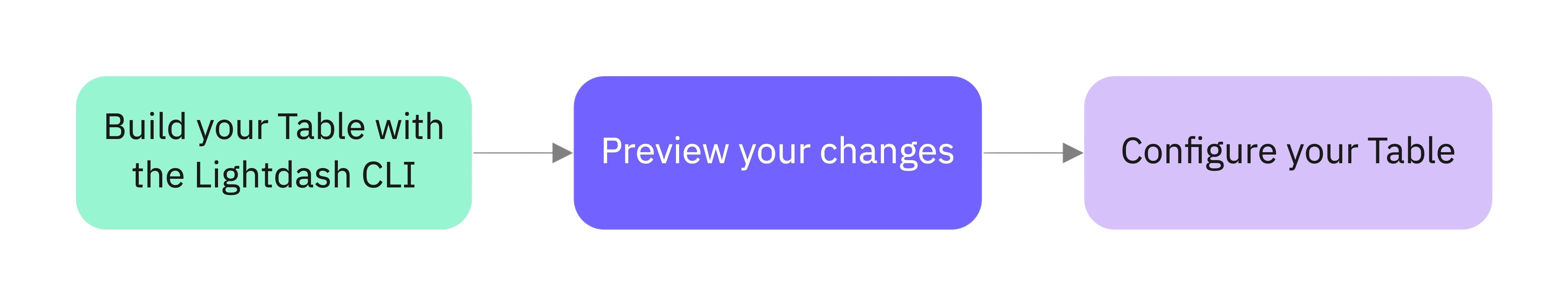 Tables are the starting point to any data exploration in Lightdash - they’re the data in Lightdash that you can query. The beauty of Lightdash is that we’re pretty well synced with your dbt project. So, in Lightdash, Tables actually come from dbt models that have been defined in your dbt project’s YAML files. If your dbt model has been defined in a YAML file, it will appear in Lightdash as a Table.Adding Tables to your Lightdash project using the CLI