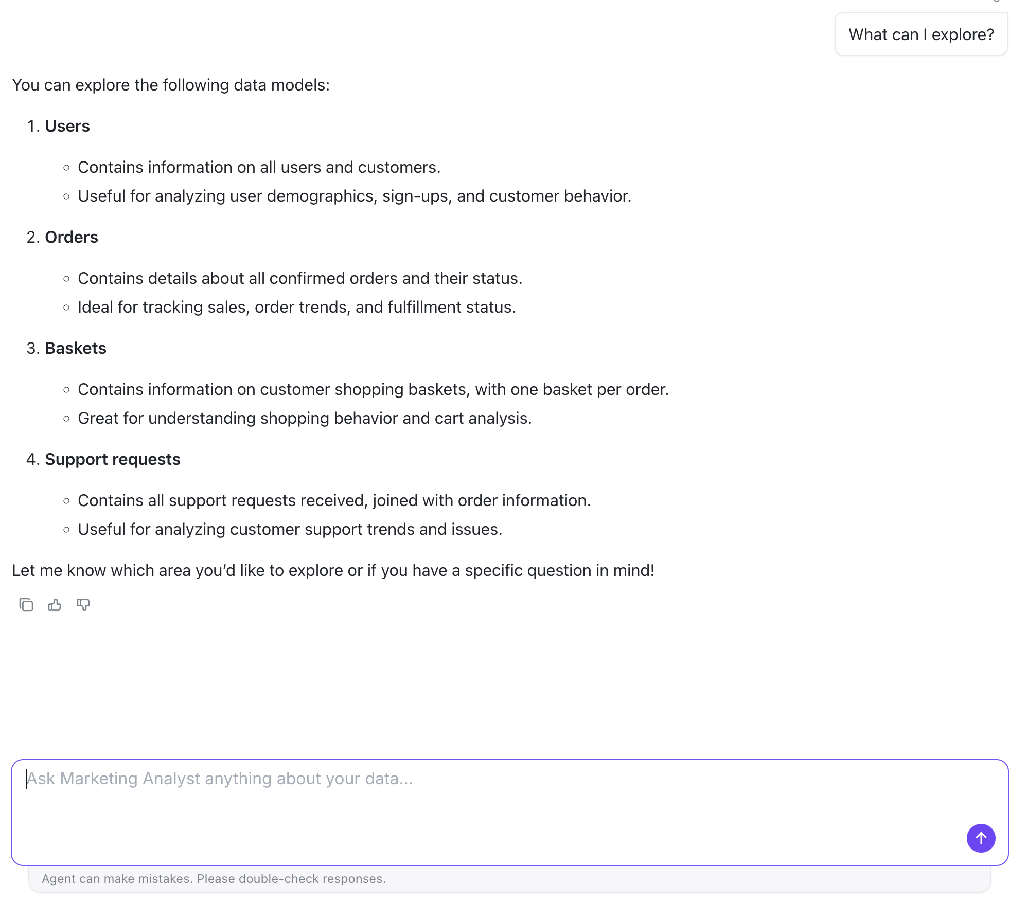 You can create multiple AI agents, each configured for different tasks, tones, languages, or teams. Each agent can have access to different datasets to focus results and give more accurate answers.Limiting access to specific explores and fields