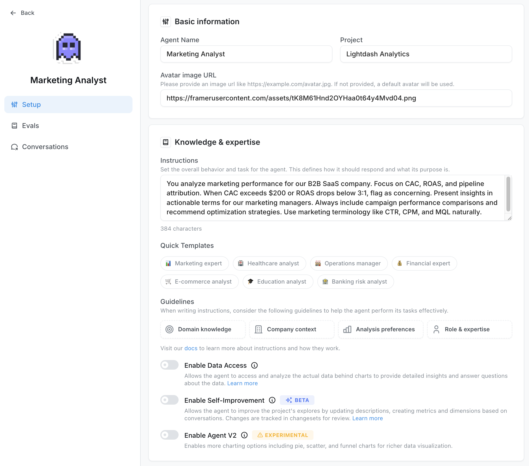 - Enable Data Access (optional) - Enable data access to allow your agent to analyze actual query results and provide insights based on the data. When disabled, agents work with metadata only